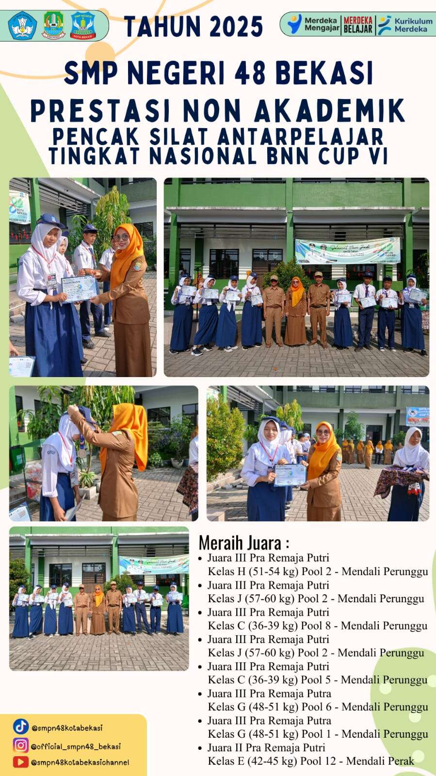 “Lewat olahraga, kita ingin membentuk karakter pelajar yang sehat, kuat, dan berintegritas. Mereka diharapkan menjadi duta antinarkoba di lingkungan masing-masing,” tambahnya. Selain memperkuat kampanye hidup sehat, BNN Cup juga menjadi wadah mempererat silaturahmi dan persaudaraan antar-pelajar dari berbagai daerah.Adapun kategori pertandingan dalam BNN Cup 6 mencakup berbagai jenjang usia, mulai dari anak-anak usia dini, pelajar SD, praremaja (SMP), hingga remaja (SMA). Dalam perlombaan ini SMPN 48 Kota Bekasi berhasil menyabet beberapa, diantaranya :